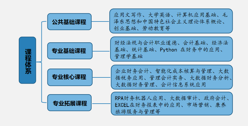 专业核心课程:企业财务会计、智能化成本核算与管理、大数据税务应用、管理会计实务、大数据财务分析、大数据财务管理、会计信息系统应用。