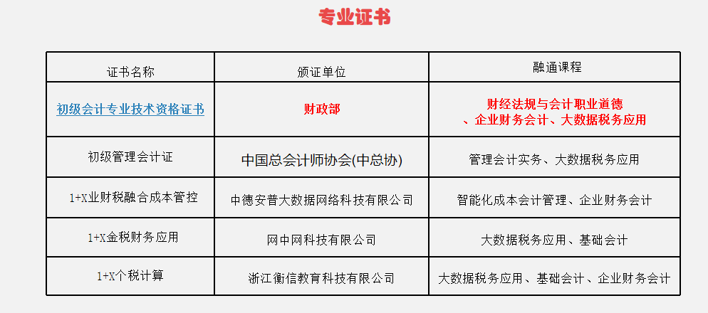 课证融通: 专业课程设置与初级会计职称、智能财税、财务数字化应用、金税财务应用(1+X)等职业资格证书/技能等级证书标准相衔接,支持学生在校期间考取权威证书,增强就业竞争力。