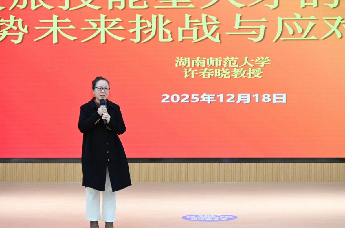 2025年12月18日下午4点,商贸旅游学院于双创楼101教室开展文旅人才发展专题讲座,特邀湖南师范大学许春晓教授担任主讲人,主题为“文旅技能型人才的供需趋势、未来挑战与应对理念”,旅游专业教师全员参与,其他专业无课教师也到场聆听交流。