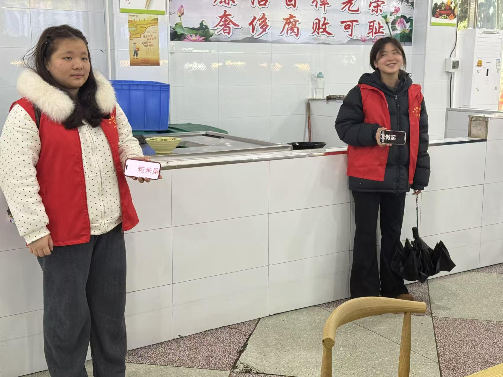 活动期间,10名青年志愿者身着统一服装,在食堂门口、取餐口向过往师生进行口头宣传,生动讲解“珍惜粮食、杜绝浪费”的重要意义,呼吁大家按需取餐、剩餐打包。在食堂就餐区,志愿者们开展文明劝导工作,对浪费粮食的行为进行温和提醒,同时为“光盘”的同学送上口头表扬与鼓励,传递节约理念。志愿者们还以身作则,带头践行光盘行动,在就餐时做到“吃光碗中食物”,用实际行动为师生树立榜样,营造了“文明用餐、珍惜粮食”的良好校园氛围。